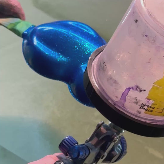 For maximum brilliance and depth, apply over a silver, fine metallic, micro-flake, or standard flake basecoat. The reflective base enhances the candy’s glow and brings out that deep, jewel-like blue tone.