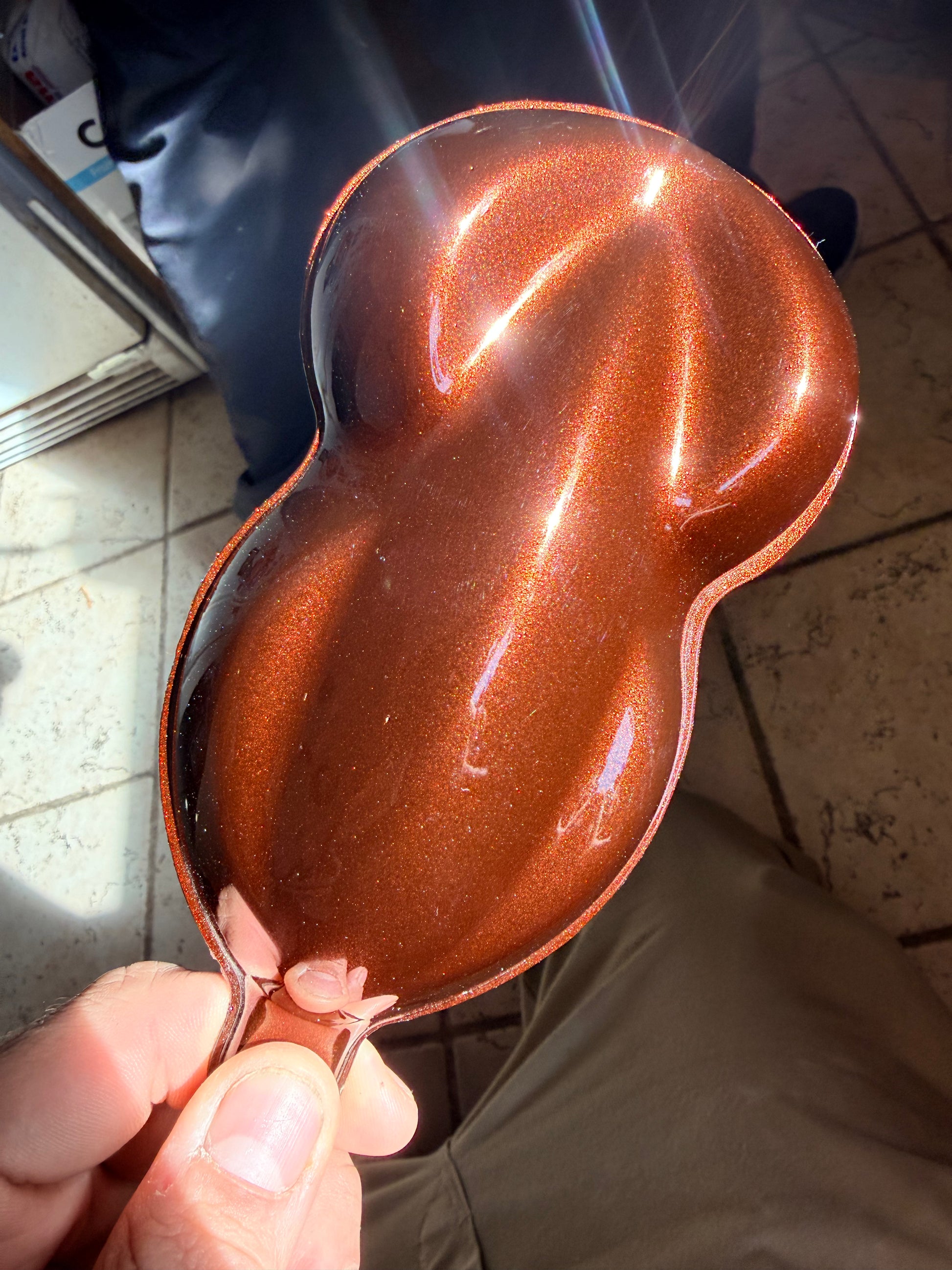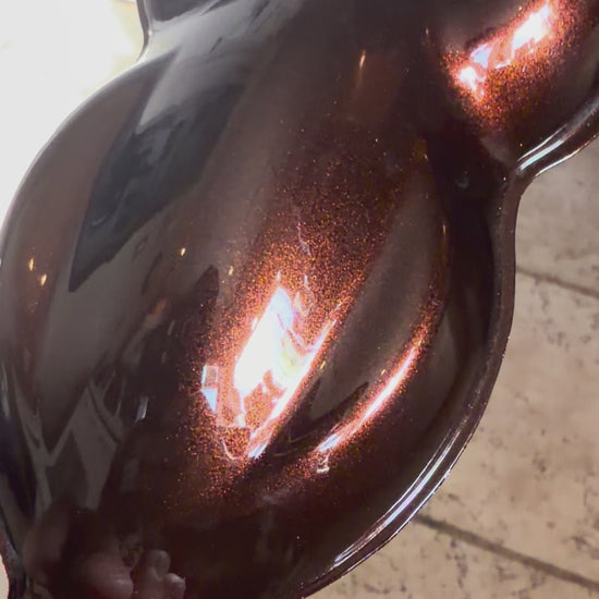 rich copper-bronze candy with intense pearl sparkle and fiery highlights that come alive under light. This color delivers a bold brown, high-end custom look with warm amber tones and glowing depth, making it perfect for lowriders, motorcycles, helmets, wheels, and show builds.