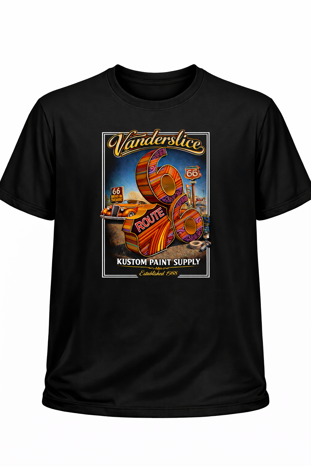 This isn’t just a tee—it’s a rolling tribute to Route 66 and the custom paint legacy behind Vanderslice Kustom Shop.